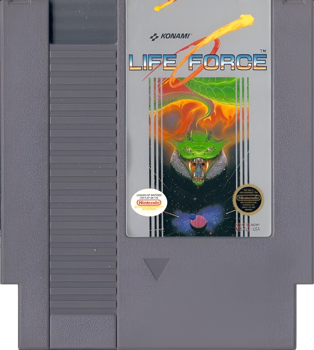 Life Force is a Konami shoot'em up game for the Nintendo Entertainment System, released on NES cartridge. This side-scrolling and vertical-scrolling action game stands out with its organic alien setting, alternating stage perspectives, and classic arcade-style difficulty.