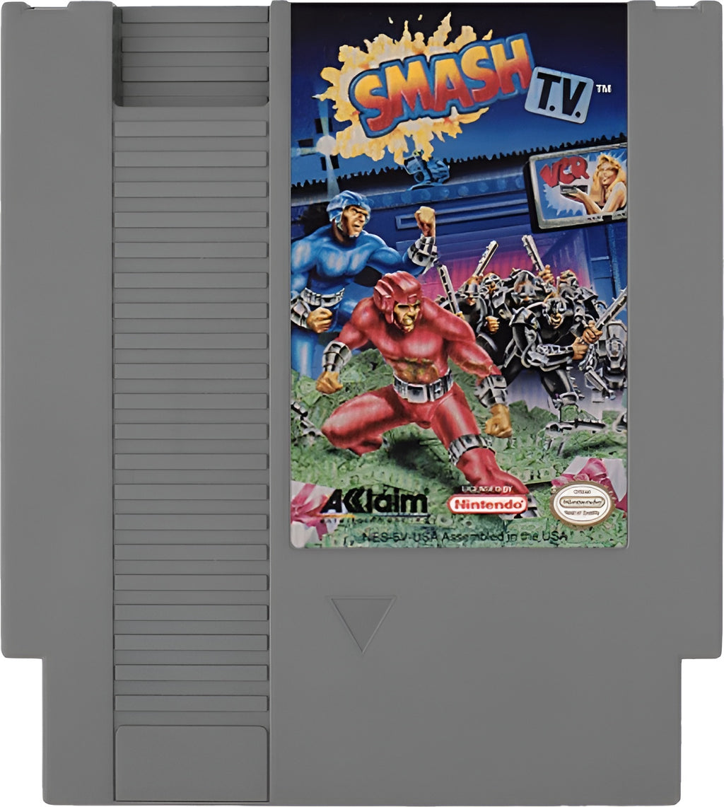 Smash TV for Nintendo Entertainment System is an NES shoot'em up game based on the over-the-top arcade action show where contestants battle through rooms packed with enemies and hazards. This home version stands out for its fast twin-stick-inspired arena combat style, frantic pacing, and local 1-2 player gameplay on a classic Nintendo cartridge.
