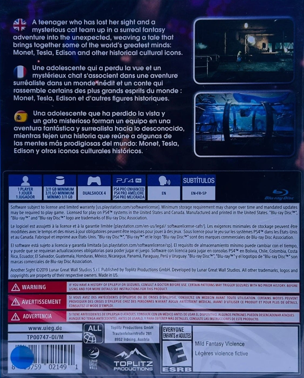 "Another Sight" for PlayStation 4 captivates players with its compelling storylines, enriched by an enchanting original soundtrack that enhances the mystique of the game's universe. Explore diverse landscapes and solve inventive puzzles that require a clever blend of strategy and intuition. Perfect for fans of adventure and puzzle genres, "Another Sight" promises hours of immersive gaming with its seamless blend of artistry and technology. Whether you're captivated by its rich narrative or drawn to its immersive gameplay, "Another Sight" offers an unforgettable experience that highlights creativity and innovation in gaming.