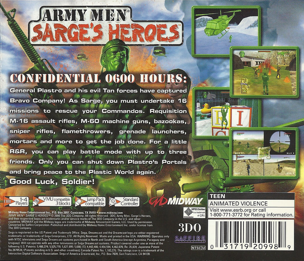 Enhanced graphics and dynamic gameplay make "Army Men: Sarge's Heroes" a standout choice for fans of military-themed adventures on the DreamCast console. The game's intuitive controls and immersive sound effects ensure an engaging experience for both new players and seasoned veterans. Embark on an epic journey that combines humor, strategy, and fast-paced action, and discover why this title remains a favorite among classic gaming enthusiasts. Perfect for collectors or anyone eager to relive the golden era of video games, "Army Men: Sarge's Heroes" is a must-have addition to your DreamCast library.