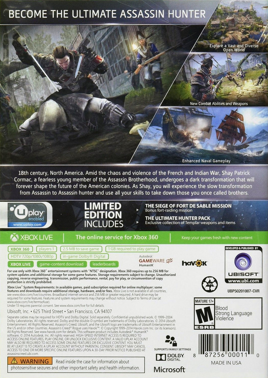 Discover the thrilling world of "Assassin's Creed Rogue," a riveting action-adventure game available for Xbox 360 that plunges you into an epic narrative filled with betrayal, exploration, and complex moral dilemmas. Set in the mid-18th century during the Seven Years' War, players take on the role of Shay Patrick Cormac, a former Assassin turned Templar, offering a fresh perspective on the expansive Assassin's Creed universe. As Shay, navigate the treacherous North Atlantic and the Appalachian River Valley, mastering new weapons and skills that allow you to hunt down your former allies in this gripping chapter of the franchise.