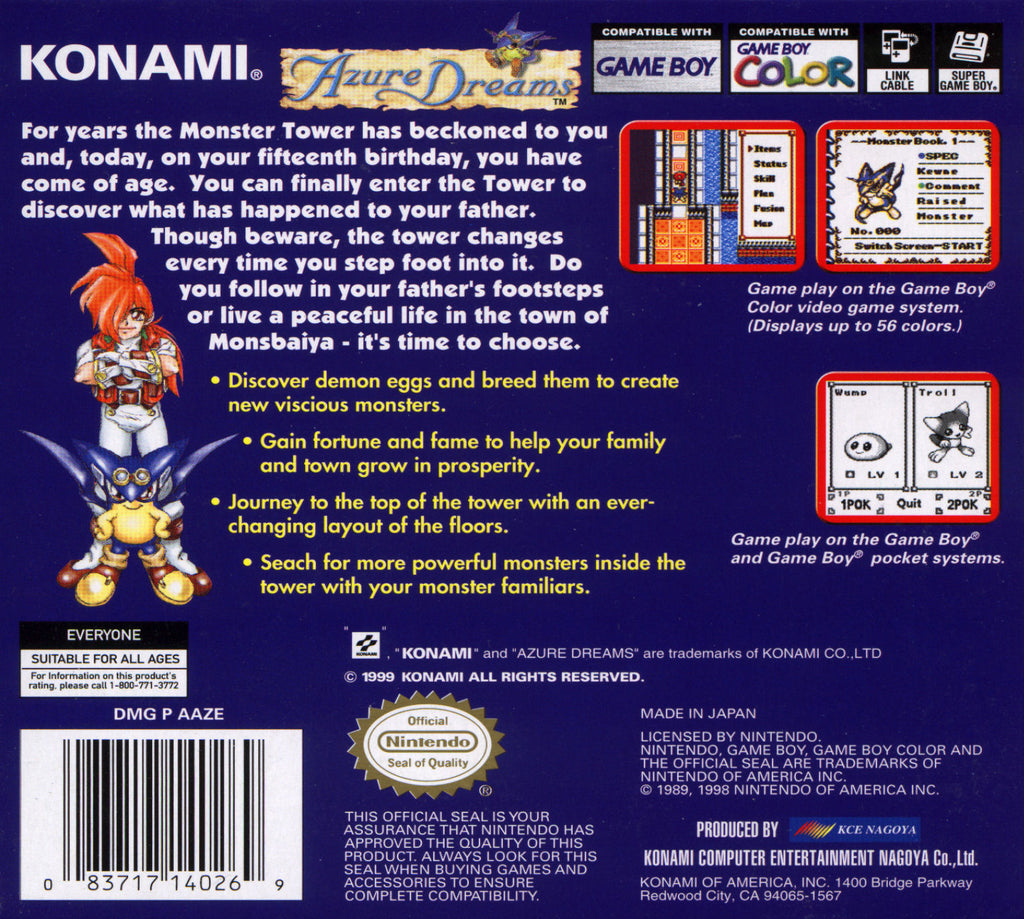Explore the enchanting world of Azure Dreams on the Game Boy Color, a captivating RPG that seamlessly blends adventure and strategy. Set in the mystical town of Monsbaiya, players embark on a thrilling quest to conquer the mysterious Monster Tower. As you navigate through the game's challenging levels, you'll be tasked with capturing and training a wide array of fantastical creatures, each with unique abilities that enhance your gameplay experience. Azure Dreams offers a richly immersive storyline, ensuring countless hours of engaging entertainment for both new and seasoned gamers.