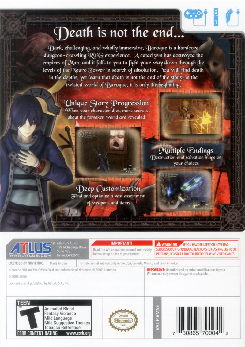 Baroque It's is an immersive action role-playing game designed for the Nintendo Wii, offering players a captivating journey into a dark and mysterious world plagued by chaos. With its intricate storyline and challenging dungeon-crawling mechanics, players are invited to unravel the mysteries and secrets that lie within the game’s haunting atmospheres. The game utilizes the Wii's unique motion controls to enhance the player's experience, making combat and exploration both engaging and intuitive. As players dive deeper into the post-apocalyptic setting, they will encounter a variety of eerie creatures and dynamic characters that add layers of depth to the overall narrative.