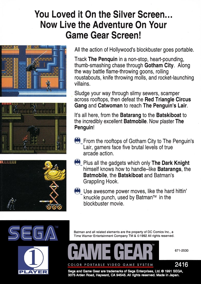 Experience the dark and thrilling world of Gotham City with "Batman Returns" for GameGear, an action-packed video game that brings the iconic 1992 film to life. Dive into the shadows and don the cape of the legendary Dark Knight as you battle notorious villains, including the treacherous Penguin and the enigmatic Catwoman, in a quest to save the city. With its edge-of-your-seat gameplay, "Batman Returns" delivers a riveting mix of side-scrolling action and pulse-pounding fights, all designed to captivate fans of the Caped Crusader.
