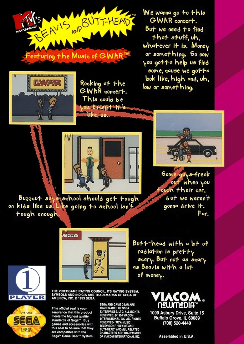 Experience the nostalgia of the 90s with the captivating "Beavis and Butthead" game for your SEGA Game Gear! Dive into the mischievous world of these iconic animated characters as they embark on outrageous adventures filled with humor, challenges, and absurdly entertaining antics. This GameGear classic offers rich graphics and engaging gameplay, making it a must-have for fans of retro gaming and lovers of the irreverent duo. Perfectly optimized for the handheld console, the game ensures smooth performance and hours of uninterrupted fun.