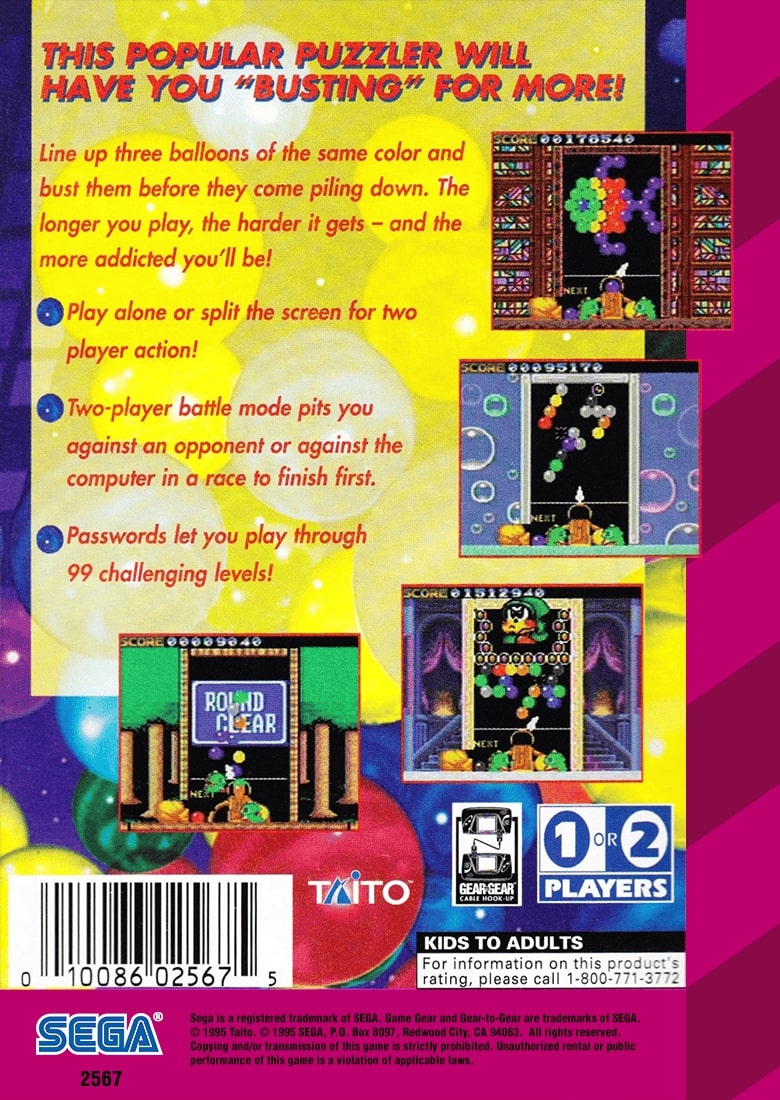 Experience endless bubble-popping fun with Bust a Move, the ultimate GameGear classic that brings vibrant puzzles and addictive gameplay to your fingertips. Dive into the colorful world of this retro favorite where you'll match and burst bubbles with precision and strategy. Designed for both new and seasoned players, Bust a Move offers escalating challenges that will keep you entertained and test your skills across dozens of engaging levels.