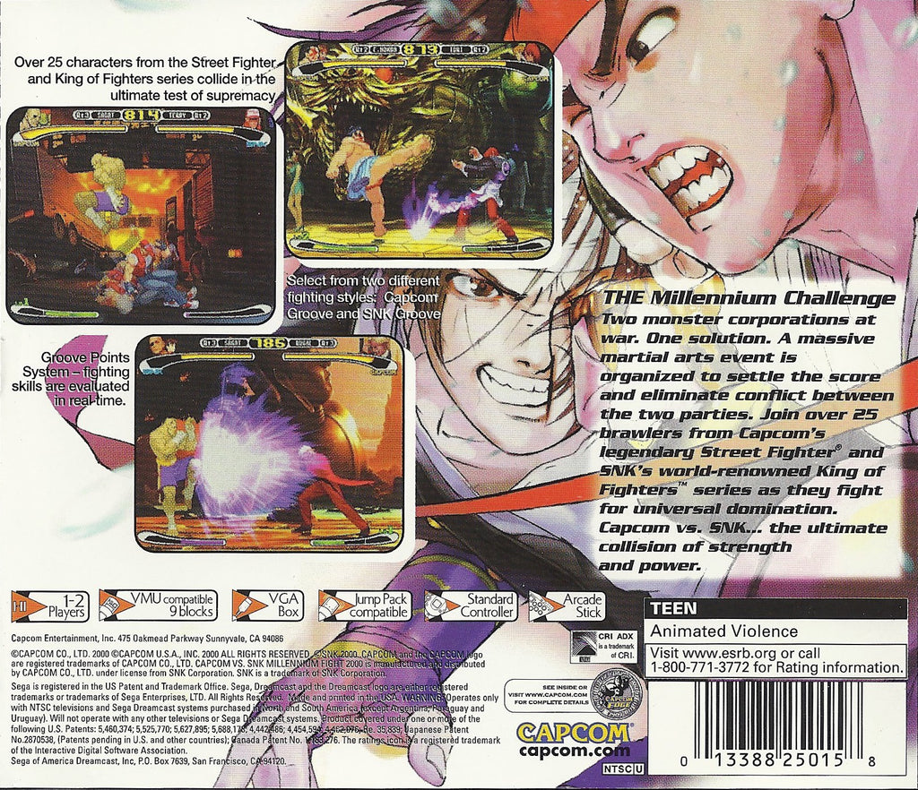 Customize your fighting experience with a diverse roster of fighters from beloved game series such as Street Fighter, King of Fighters, and Samurai Shodown. Engage in thrilling single-player modes or challenge friends in local multiplayer for intense head-to-head battles. "Capcom vs SNK" on Dreamcast is not just a game; it's a nostalgic journey for fans of classic arcade fighters and a must-have addition to any Dreamcast collection. Whether you're a veteran player or discovering these iconic characters for the first time, this game promises hours of competitive and nostalgic excitement.