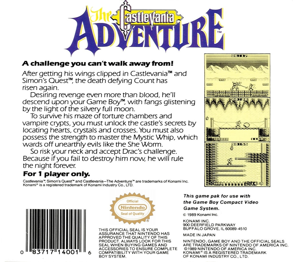 Designed specifically for the Game Boy, this title exemplifies the handheld's capacity to deliver rich and engaging experiences on the go. "The Castlevania Adventure" remains a fan favorite due to its compact yet immersive design and clever use of the Game Boy's capabilities. Playing on your Game Boy, you'll experience the thrill of climbing walls, dodging traps, and battling formidable foes, all in a quest to bring peace back to the land. Whether you're a collector searching for a vintage gaming gem or a newcomer eager to explore a beloved series, this game promises to deliver an unforgettable vampire-hunting adventure.