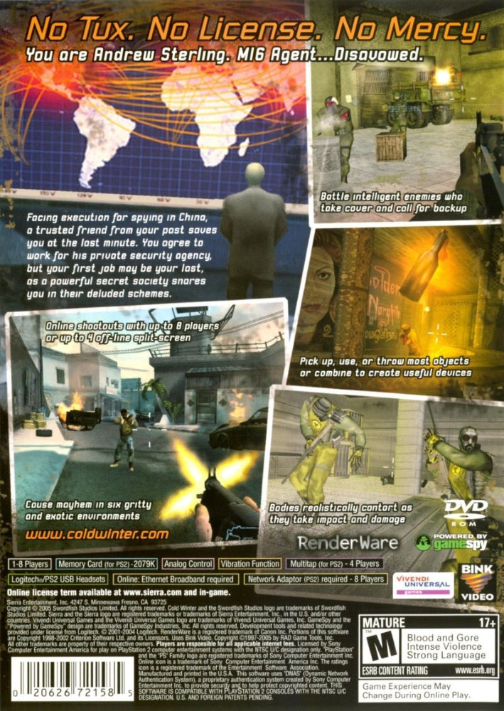 Explore the intense world of "Cold Winter," the ultimate action-packed first-person shooter for the PlayStation 2. Immerse yourself in a gripping narrative as you uncover international espionage and conspiracy, complete with fully immersive environments and realistic physics that push the PS2's capabilities. "Cold Winter" offers an unparalleled gaming experience with its detailed graphics, dynamic lighting effects, and complex character interactions that will keep you on the edge of your seat.