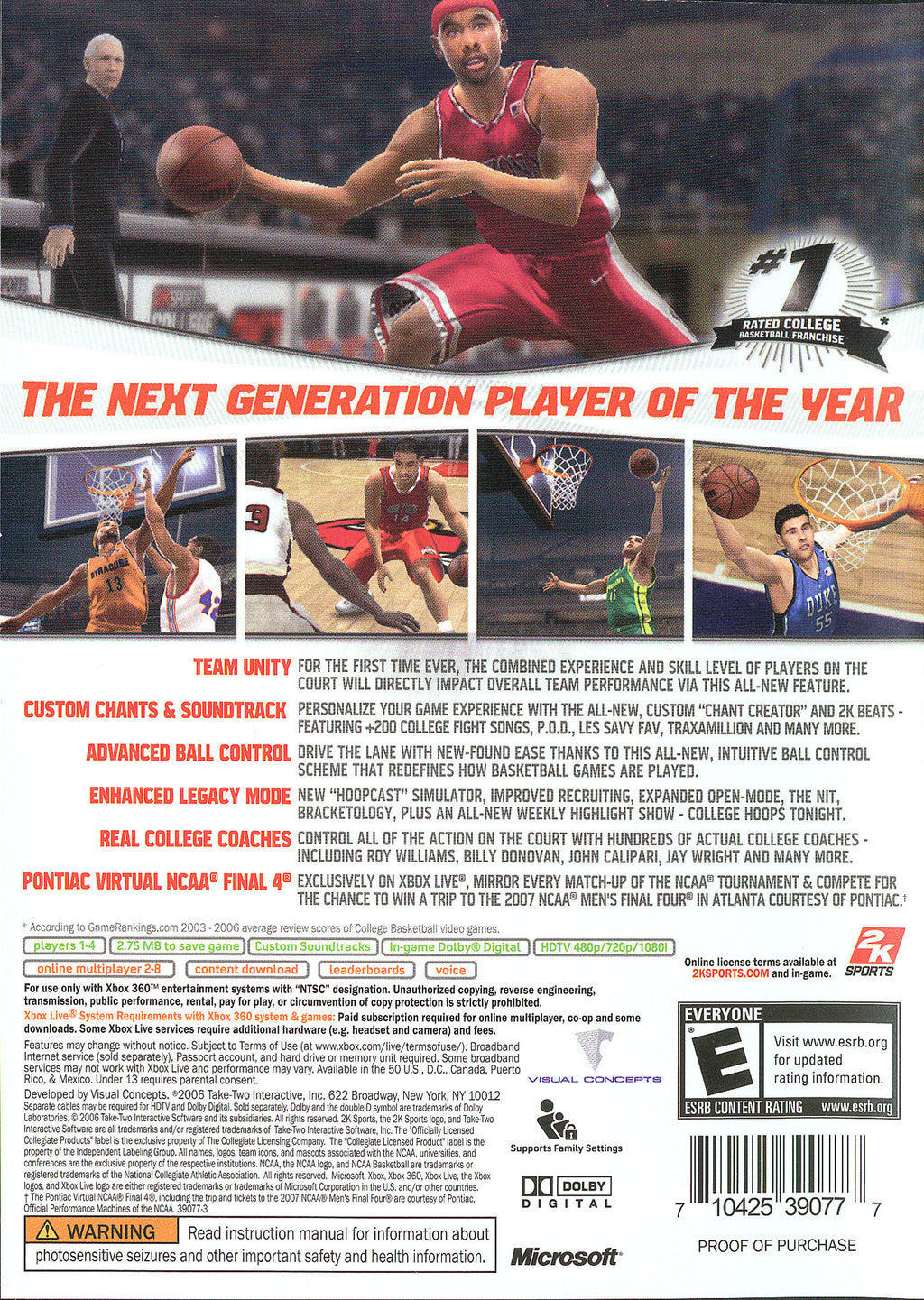 Challenge yourself with multiple game modes, including Legacy Mode, where you build your own dynasty, and Online Multiplayer to compete against friends and other players worldwide. Whether you're a seasoned gamer or a college basketball enthusiast, College Hoops 2K7 delivers engaging gameplay and endless entertainment. Elevate your gaming experience and join the ranks of college basketball's elite with College Hoops 2K7 for Xbox 360 today.