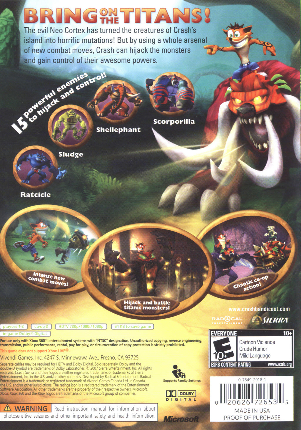 "Crash of the Titans" for Xbox 360 delivers stunning graphics and engaging storytelling, making it a must-have for fans and newcomers alike. Perfect for those seeking both nostalgia and fresh adventures, this title captures the essence of classic Crash Bandicoot games while incorporating modern enhancements and controls. Explore unique lands, conquer epic bosses, and experience Crash's antics in high definition. Whether you're playing solo or with a friend in cooperative mode, "Crash of the Titans" offers endless hours of entertainment and challenge for all Xbox 360 enthusiasts.