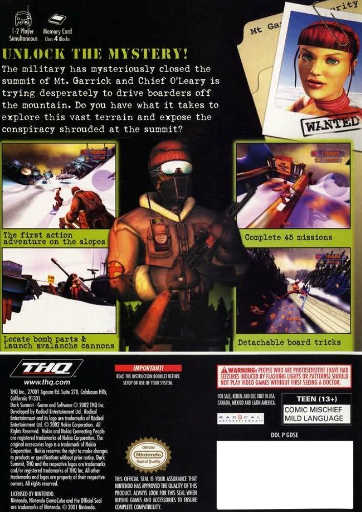 Discover the thrill and adventure of "Dark Summit" on the GameCube, where skiing meets intense gameplay in a unique mountain setting. This captivating action-adventure game challenges players to explore a sprawling ski resort, uncovering hidden secrets and thwarting a sinister plot threatening the snowy paradise. With intuitive controls, immersive graphics, and a dynamic storyline, "Dark Summit" offers both seasoned gamers and newcomers an exhilarating experience on the slopes.