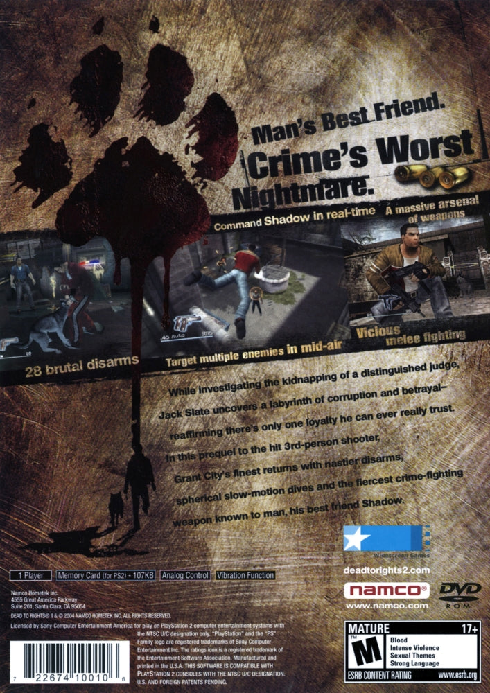 Dead to Rights 2 for PS2 is an action-packed third-person shooter that plunges players into the gritty world of Grant City. As Jack Slate, a hard-boiled cop, you are tasked with taking down a network of criminals using a dynamic mix of gunplay and hand-to-hand combat. The game features intense firefight sequences with a vast array of weapons, alongside cerebral puzzle-solving elements that keep players engaged. Enhanced graphics and a captivating storyline ensure that every mission is as immersive as it is challenging. The companion system allows you to team up with Shadow, Jack’s loyal canine partner, to execute strategic takedowns and unravel the mystery behind the corruption in the city.