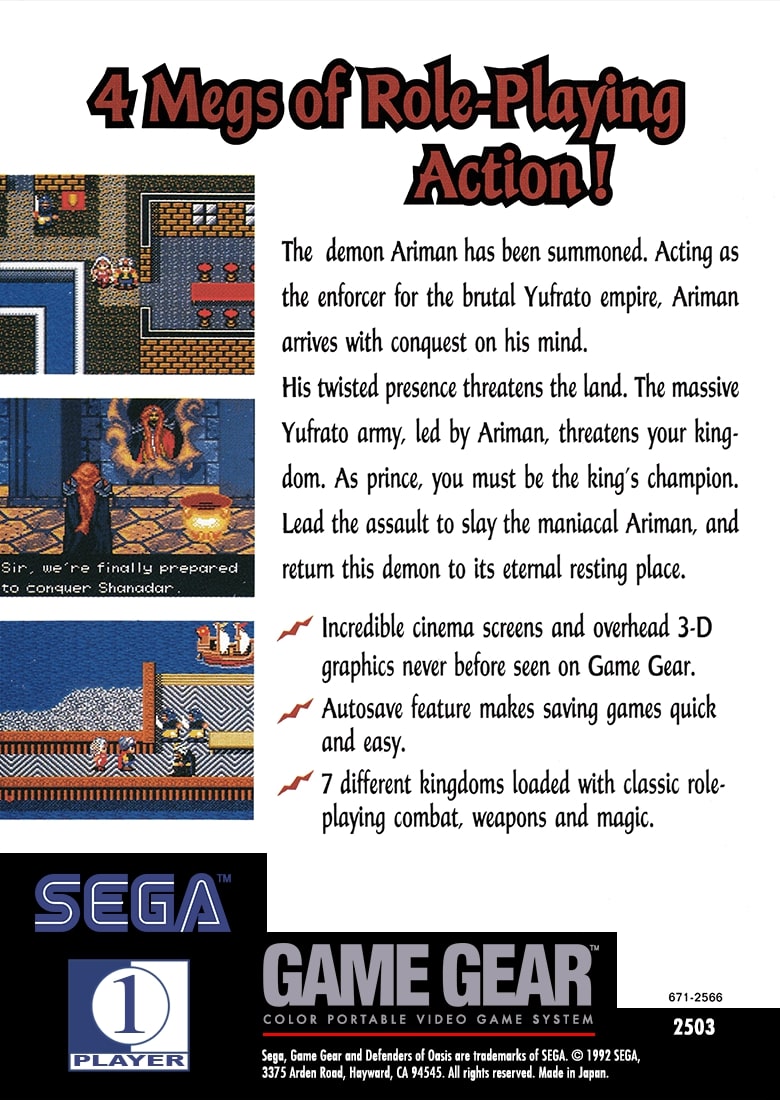 Discover the enchanting world of Defenders of Oasis, an enthralling adventure RPG exclusively for the GameGear. Immerse yourself in the mystical Arabian Nights-inspired storyline where you, the prince, must defend your kingdom against the wicked Genie and his malevolent forces. With richly detailed graphics and captivating soundtracks, Defenders of Oasis delivers a nostalgic gaming experience that is both visually and audibly delightful. Traverse beautifully designed landscapes, engage in strategic turn-based battles, and unravel the secrets that lie within this classic gem.