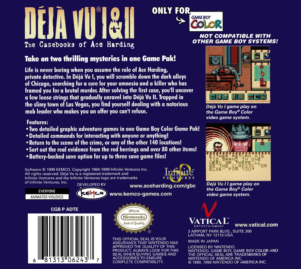 Discover the thrilling world of "Deja Vu I & II" for Game Boy Color, a captivating game that merges classic detective storytelling with immersive gameplay. This unique collection features two iconic adventures, allowing players to step into the shoes of detective Ace Harding as they unravel gripping mysteries filled with unexpected twists and turns. With its vibrant graphics tailored for the Game Boy Color, "Deja Vu I & II" offers a visually engaging experience that captivates both new players and nostalgic gamers alike.