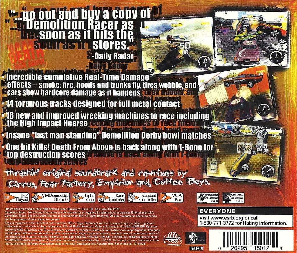 Unleash chaos and adrenaline-fueled action with "Demolition Racer: No Exit" for the DreamCast, a must-have for racing game enthusiasts seeking an explosive experience. This exhilarating game immerses players in intense, high-octane demolition races where strategy and destruction collide. Featuring a variety of vehicles, each with unique strengths, and a range of challenging tracks, this game keeps the excitement at peak levels. The dynamic graphics and realistic sound effects amplify the thrill as you outmaneuver opponents and wreak havoc on the track.