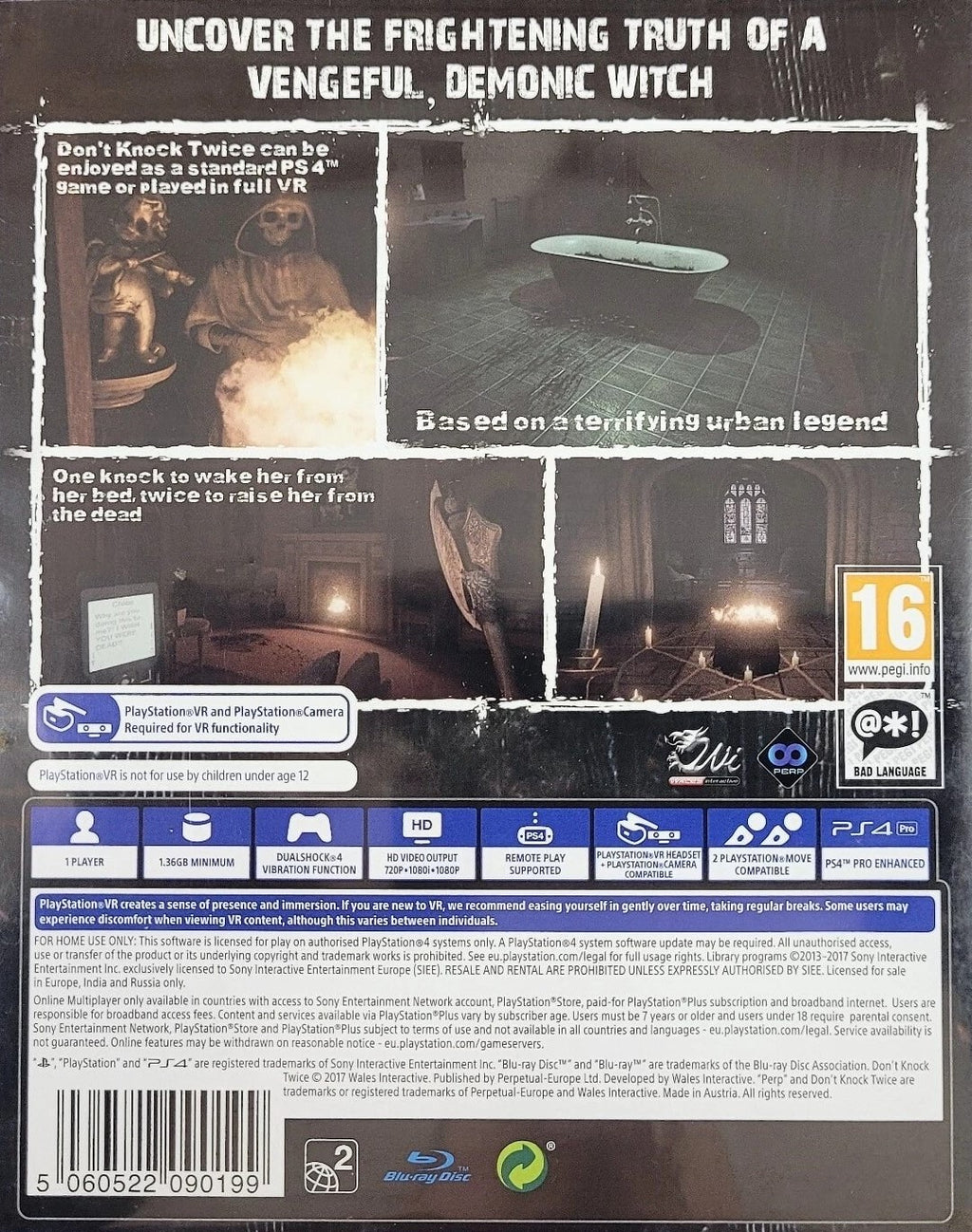 Perfectly optimized for the PS4 platform, "Don't Knock Twice [Europe]" offers smooth performance and seamless controls, ensuring an unparalleled horror experience. Whether you're a seasoned horror game aficionado or a newcomer to the genre, this game promises to deliver thrills and intense moments that will keep you coming back for more. Dive into the supernatural world and discover the secrets that lie within, if you dare to knock twice. Ideal for both solo players and those who enjoy sharing the fear with friends, this game is a must-have addition to any horror enthusiast's collection. Unlock spine-tingling achievements as you face your fears and confront the unknown in "Don't Knock Twice [Europe]."