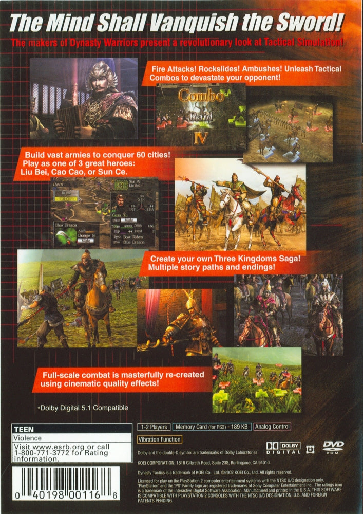 Experience the strategic brilliance of ancient warfare with "Dynasty Tactics" for the PS2, where history and strategy collide in an epic battlefield encounter. Immerse yourself in a dynamic tactical gameplay experience set during the tumultuous Three Kingdoms period of Chinese history. As a master tactician, you'll command legions of warriors, implement ingenious strategies, and forge alliances to secure victory. The game's richly detailed graphics and engaging storyline offer an unparalleled depth, capturing both the excitement and the complexity of ancient military campaigns. Designed for both newcomers and veteran strategy enthusiasts, "Dynasty Tactics" challenges players to think critically and plan ahead to conquer their enemies and achieve ultimate dominance.