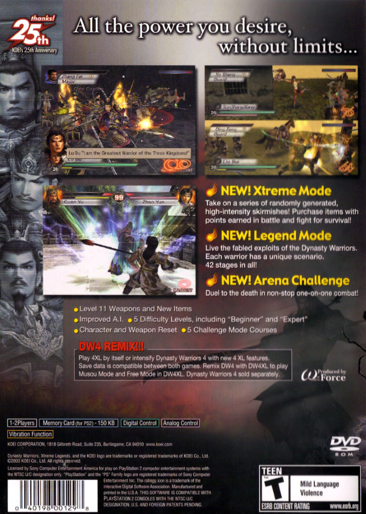Enhance your gaming experience with Dynasty Warriors 4 Xtreme Legends by exploring innovative game modes that heighten replay value and strategic possibilities. Customize your favorite warriors with a variety of upgrades and create the ultimate force to conquer intense challenges. Compatible with the original Dynasty Warriors 4, this PS2 classic allows for file transfers and cooperative gameplay, offering enriched storytelling and fresh, dynamic content. Whether you're seeking high-paced action or strategic planning, Dynasty Warriors 4 Xtreme Legends delivers a compelling gaming experience with rich graphics and immersive soundtracks that transport you back in time.