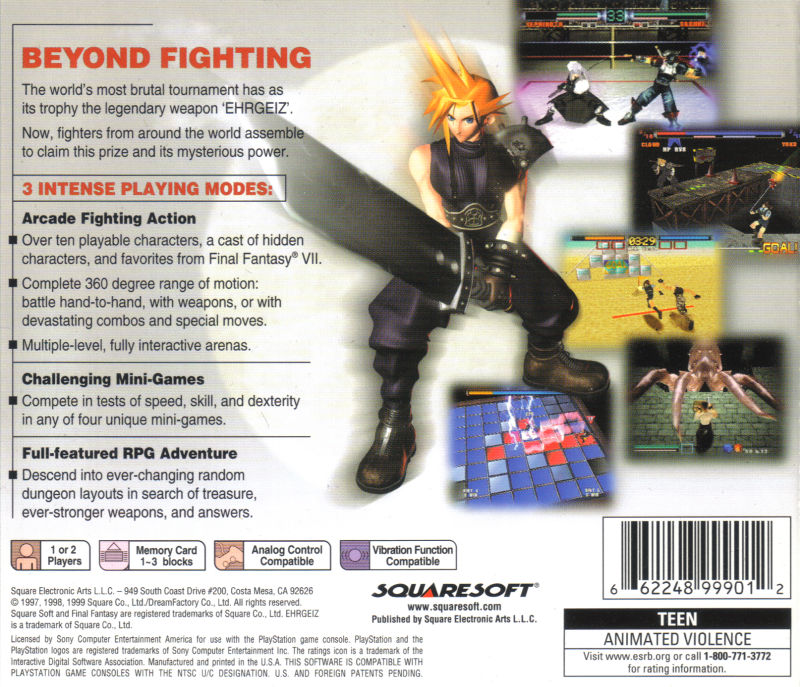 In addition to its vibrant characters and immersive combat, Ehrgeiz also includes an intriguing role-playing mode that offers a different type of challenge. Players can navigate intricate dungeons, collect valuable items, and unlock hidden secrets that add depth and replayability to the core fighting experience. The game's robust multiplayer mode enhances its appeal, allowing friends to compete in intense battles that test their skills and strategy. Whether you are an avid fighting game enthusiast or a PlayStation collector looking to expand your library, Ehrgeiz represents a must-have title that blends the best of fighting and adventure genres. Dive into this classic PlayStation game and experience the thrill of battle and discovery today!