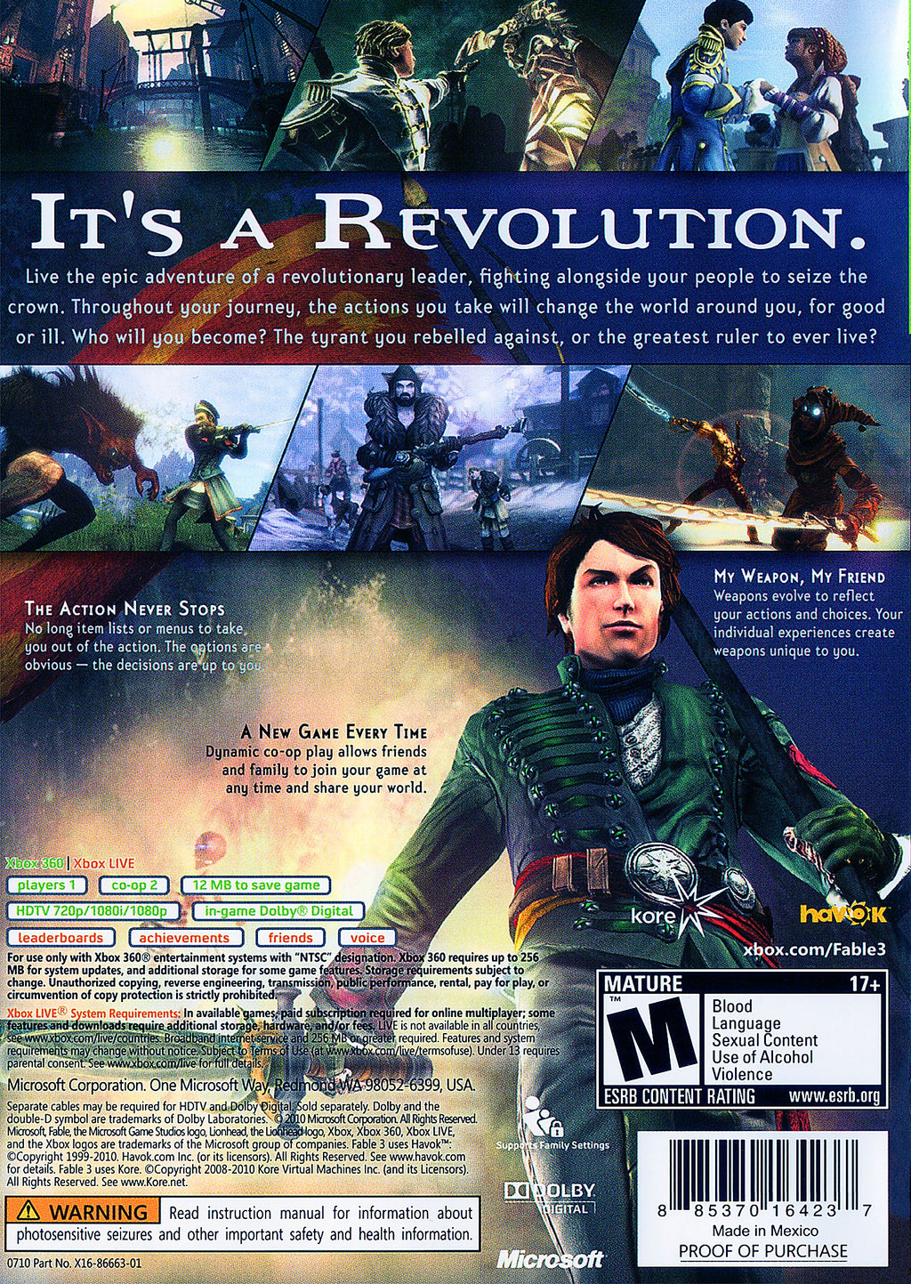 Explore a beautifully expansive environment as you interact with a vast array of characters and face challenging foes. "Fable 3" for Xbox 360 delivers not just a game but an unforgettable journey enhanced by stunning graphics and an engaging soundtrack. Its cooperative gameplay option lets you share this epic saga with friends, enhancing the excitement and depth of your adventure. Perfect for both die-hard fans of the "Fable" series and newcomers, this game offers endless hours of entertainment and replayability. Embark on your journey to become the ruler of Albion and define your legacy in "Fable 3."