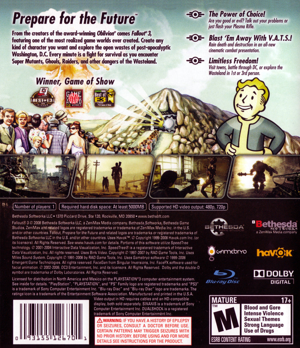 The PS3 version of Fallout 3 includes intuitive controls and enhanced visuals designed to maximize the console's capabilities, delivering smooth gameplay and captivating graphics. Whether you're a fan of intense combat, intricate quests, or character progression, Fallout 3 caters to all, offering customizable skills and weapons that let you tailor your gameplay. Compatible with the PlayStation 3 system, this game is a must-have for any RPG enthusiast looking to experience the pinnacle of post-nuclear adventure. Embark on a journey of survival, exploration, and discovery that will leave you questioning the morality of every decision you make.