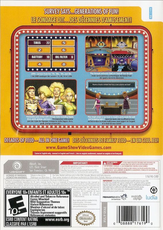 "Family Feud Decades" for the Wii offers a nostalgic journey through time, combining vibrant retro graphics and classic sound effects that enhance the game show experience. Whether you're a fan of the original game shows or looking to introduce your family to the fun, this game is perfect for players of all ages. Its intuitive controls and fast-paced gameplay make it easy for everyone to join in the excitement. Dive into the fun of "Family Feud Decades" today and relive the cherished moments of TV trivia with your loved ones.