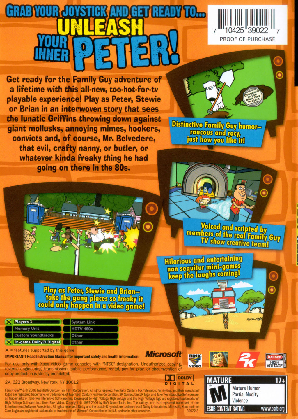 Explore familiar locations, tackle quirky missions, and encounter beloved characters as you navigate through various comedic scenarios. With its vibrant graphics and authentic voice-overs, "Family Guy" for Xbox captures the essence of the beloved series, delivering an immersive experience that both long-time fans and casual gamers will enjoy. Perfect for solo play or sharing laughs with friends, this game brings the hilarity of "Family Guy" directly to your console, making it a must-have addition to your Xbox collection.