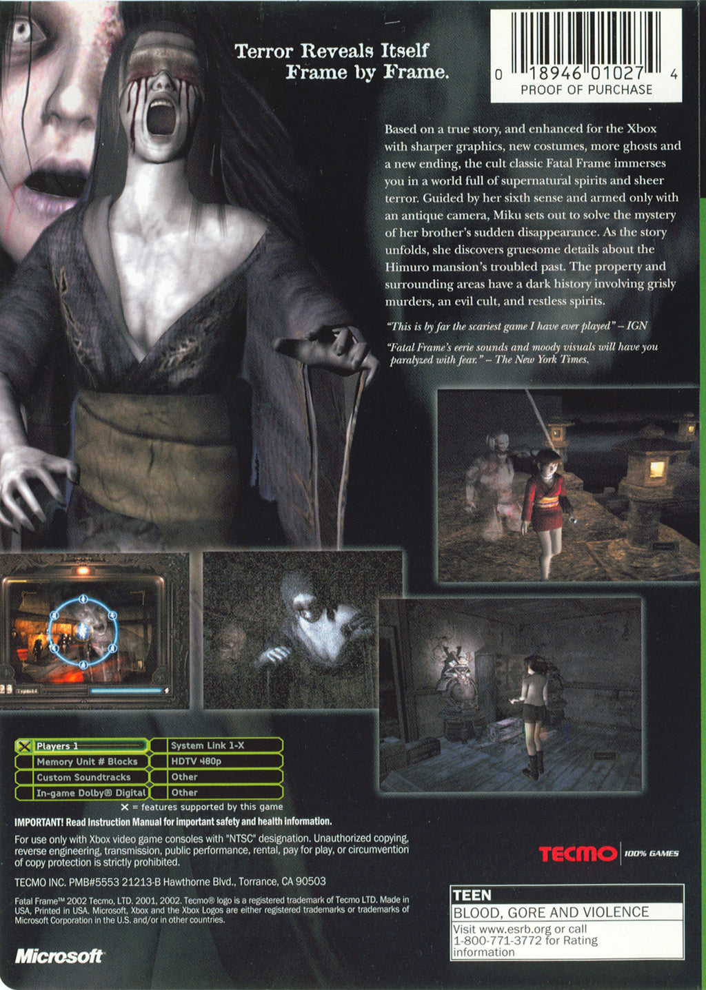 Discover the spine-chilling world of *Fatal Frame* for Xbox, where every shadow hides a sinister secret. In this critically acclaimed survival horror game, players take on the role of a young protagonist armed with the mystical Camera Obscura, a unique tool capable of capturing and sealing away malevolent spirits. Immerse yourself in a hauntingly atmospheric setting, rich with eerie soundscapes and intricate lore that will keep you on the edge of your seat.