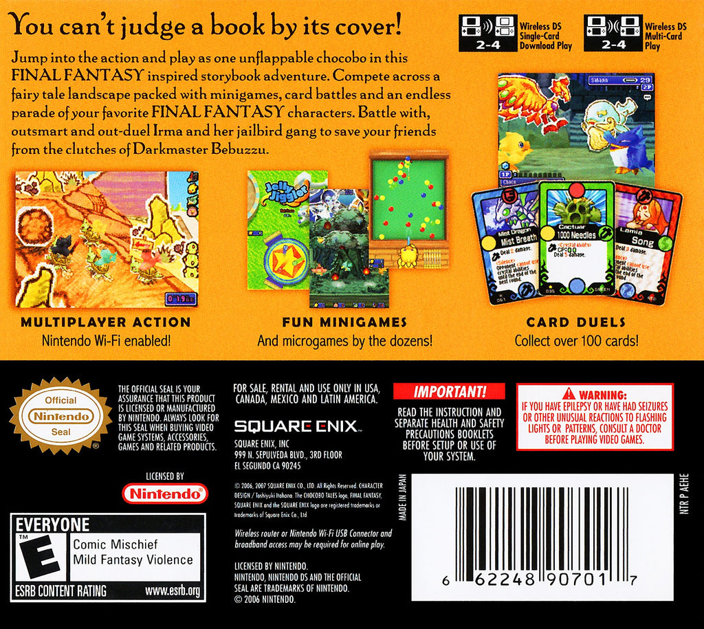 Discover the enchanting world of "Final Fantasy Fables: Chocobo Tales" for the Nintendo DS, where beloved characters from the Final Fantasy universe come to life in a delightful blend of adventure and classic card battle gameplay. This engaging title invites players to dive into a whimsical story starring the adorable Chocobo, as you embark on a quest filled with challenging mini-games, strategic battles, and captivating storylines. Designed to utilize the DS's dual-screen capabilities, every moment in "Chocobo Tales" offers an interactive and immersive experience that brings traditional fairy tales to a new, enchanting height.
