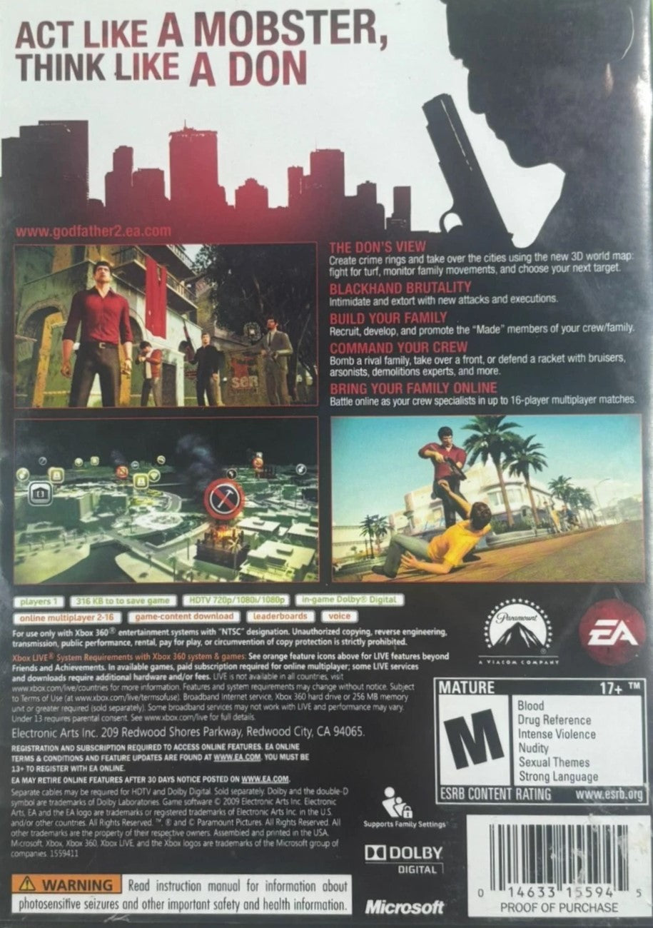 This action-adventure game combines elements of strategy and RPG, offering a unique blend of storytelling and tactical gameplay. Customize your family's skills and equipment, forge alliances, and take control of territories as you expand your influence across multiple cities. "The Godfather II" for Xbox 360 delivers an unforgettable gaming experience that captures the intensity and drama of the criminal underworld, featuring stunning graphics and an immersive storyline that keeps you engaged from start to finish.