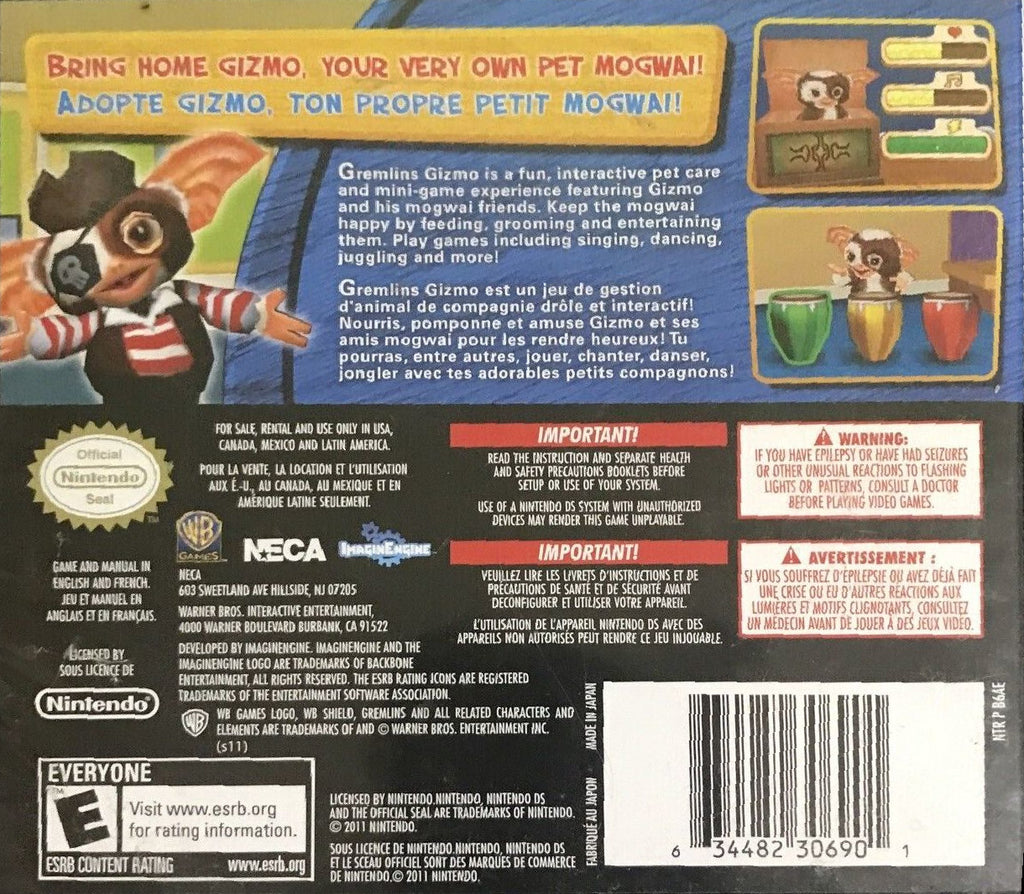Introducing the *Gremlins Gizmo* DS, the must-have interactive companion for fans of the iconic 80s movie. This delightful digital rendition captures the essence of Gizmo, the adorable Mogwai, offering hours of entertainment and nostalgia. Designed for the Nintendo DS, users can immerse themselves in engaging mini-games, puzzles, and challenges, all themed around the beloved Gremlins universe. Perfect for collectors and new fans alike, this interactive experience combines modern gaming technology with a classic film favorite.