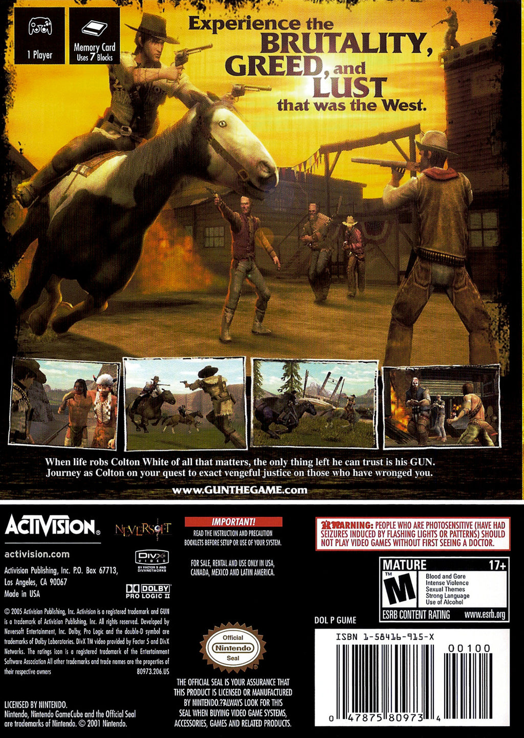 Experience the Wild West like never before with "Gun" for the Nintendo GameCube, an action-packed adventure game that immerses players in an expansive, open-world frontier. Set in the lawless terrain of the 1880s American West, this game offers an engaging storyline where you play as Colton White, a rugged gunslinger on a quest for vengeance. Explore vast landscapes, from harsh deserts to bustling towns, while engaging in intense gunfights and high-stakes missions. The realistic graphics and dynamic gameplay provide an authentic Western experience that keeps players on the edge of their seats.