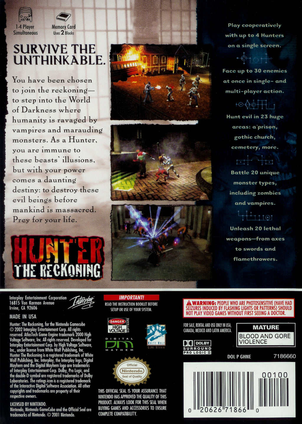 "Available exclusively on the GameCube platform, "Hunter: The Reckoning" maximizes the console's capabilities to deliver stunning graphics and smooth performance. Whether playing solo or with friends, the multiplayer mode offers an exciting cooperative experience, making it a perfect game for gatherings and competitive play. The intuitive controls and customizable character abilities provide players with a unique and tailored gaming experience. Enhance your collection with "Hunter: The Reckoning" and dive into a world where every decision counts and every battle brings you one step closer to victory.