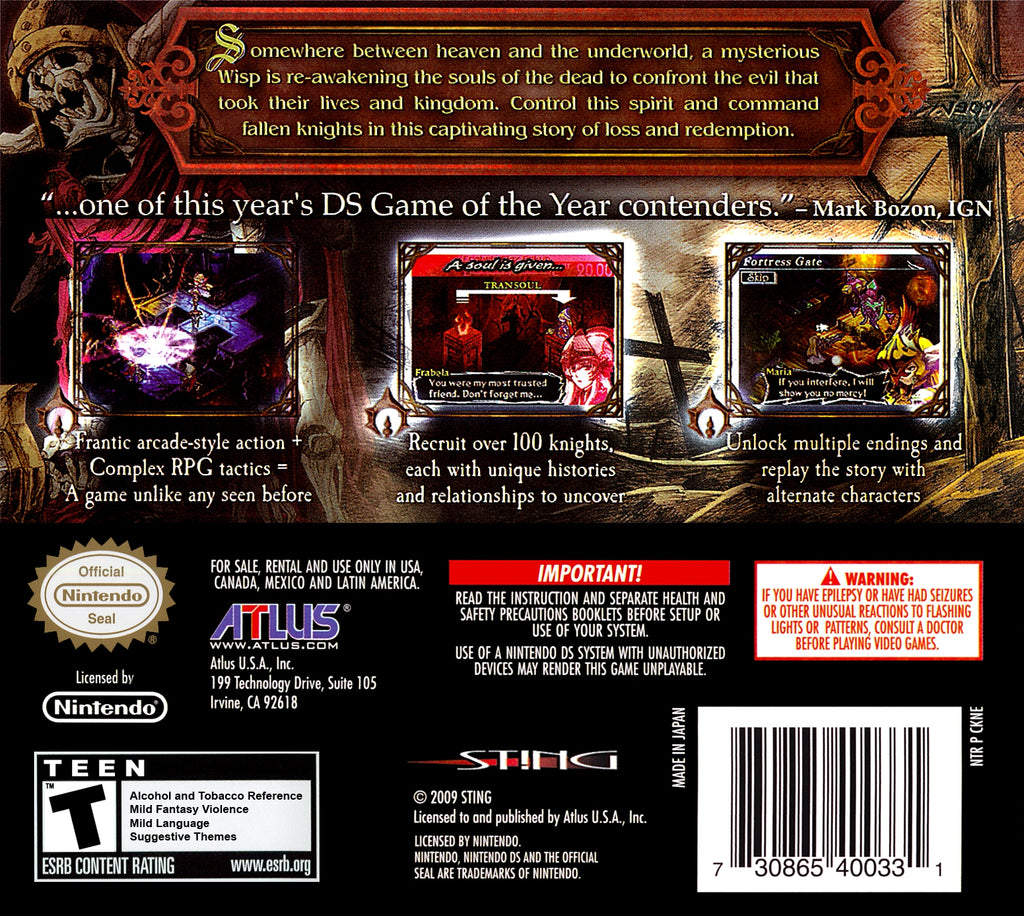 Discover the captivating world of "Knights in the Nightmare," a unique and critically acclaimed tactical RPG available for the Nintendo DS. This innovative and enigmatic game challenges players to master its intricate blend of action, strategy, and puzzle-solving elements. With its visually stunning graphics and immersive storyline, "Knights in the Nightmare" offers a mesmerizing experience where you'll guide the souls of fallen knights in a gothic fantasy setting.