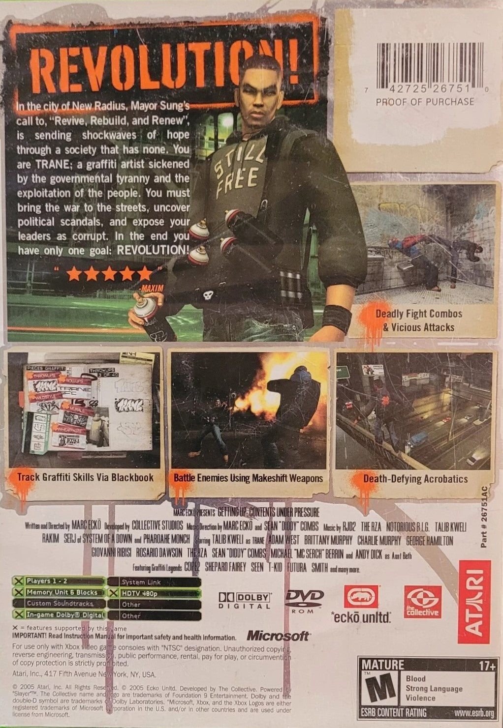 Designed for gamers who thrive on creativity and strategy, "Getting Up: Contents Under Pressure" offers a unique blend of gameplay elements. Enjoy a rich soundtrack that compliments the gritty, immersive atmosphere, with tracks from renowned hip-hop artists. With its engaging narrative, visually stunning graphics, and a variety of challenging missions, this game promises hours of exciting entertainment. Perfect for fans of both street art and innovative gameplay, this must-have Xbox title pushes boundaries and redefines the action-adventure genre. Explore the raw authenticity of street culture and leave your legacy in Marc Ecko's unforgettable gaming experience.