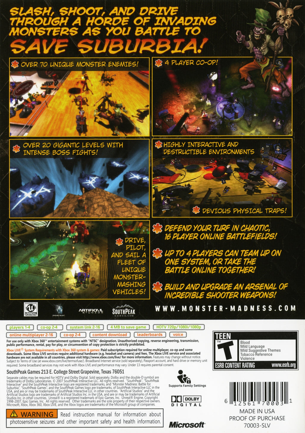 Experience exhilarating action with "Monster Madness: Battle for Suburbia" for Xbox 360, a thrilling game that combines classic arcade-style gameplay with modern graphics and engaging storylines. Dive into a world overrun by monsters as you and your friends strategize to save your suburban hometown from the impending apocalypse. Designed for both solo and multiplayer modes, this game offers hours of fun with its diverse range of levels, unique monsters, and an arsenal stocked with quirky, customizable weapons. The vibrant graphics and immersive soundscapes bring a new dynamic to the classic monster-bashing genre, ensuring that you'll be on the edge of your seat from start to finish.