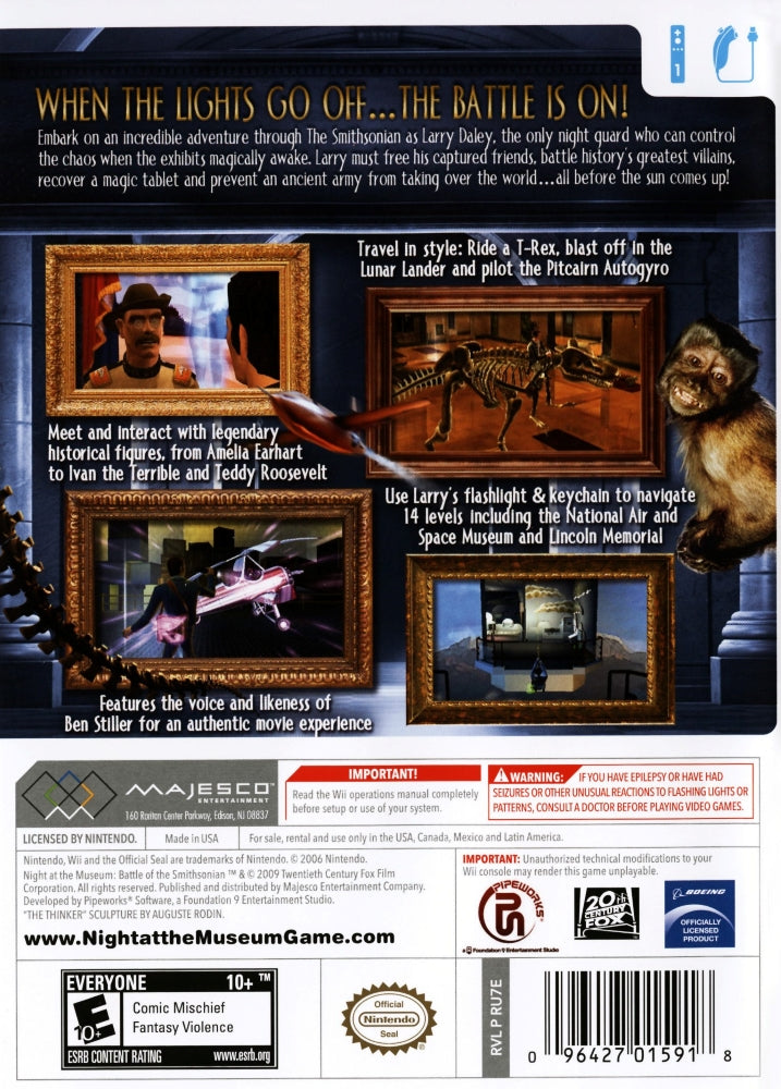 Experience the thrill of history coming to life with "Night at the Museum: Battle of the Smithsonian" for the Wii. This interactive game transports players into the heart of the Smithsonian Institution, where famed exhibits magically animate, creating exciting and unpredictable challenges. Designed for both casual gamers and history enthusiasts, the game combines dynamic storytelling with engaging gameplay that will entertain the whole family. With intuitive controls tailored for the Wii console, players can navigate through iconic museum environments and solve puzzles alongside beloved characters. This adventure promises a blend of education and entertainment, making history fun for everyone.
