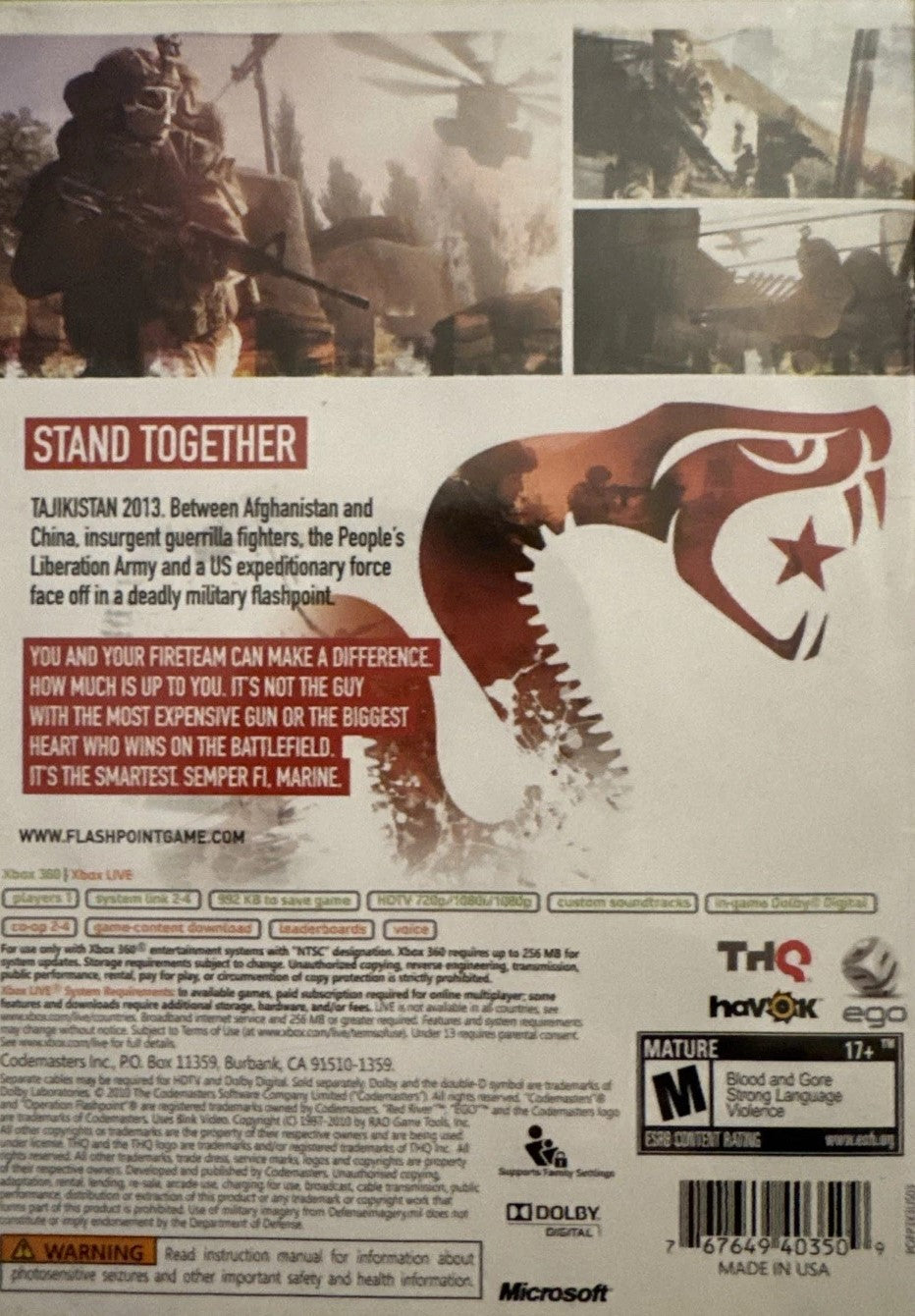 Experience the intense and immersive gameplay of "Operation Flashpoint: Red River" on the Xbox 360, where tactical shooting meets realistic military strategy. Set in the rugged terrain of Tajikistan, this action-packed first-person shooter takes you into the midst of a fictional conflict, offering both single-player and cooperative multiplayer modes. With an emphasis on teamwork and strategic planning, you'll lead a squad of elite Marines against unpredictable insurgent forces, utilizing a wide array of authentic weaponry and equipment. Each mission presents unique challenges, requiring players to adapt and execute precise maneuvers for success.