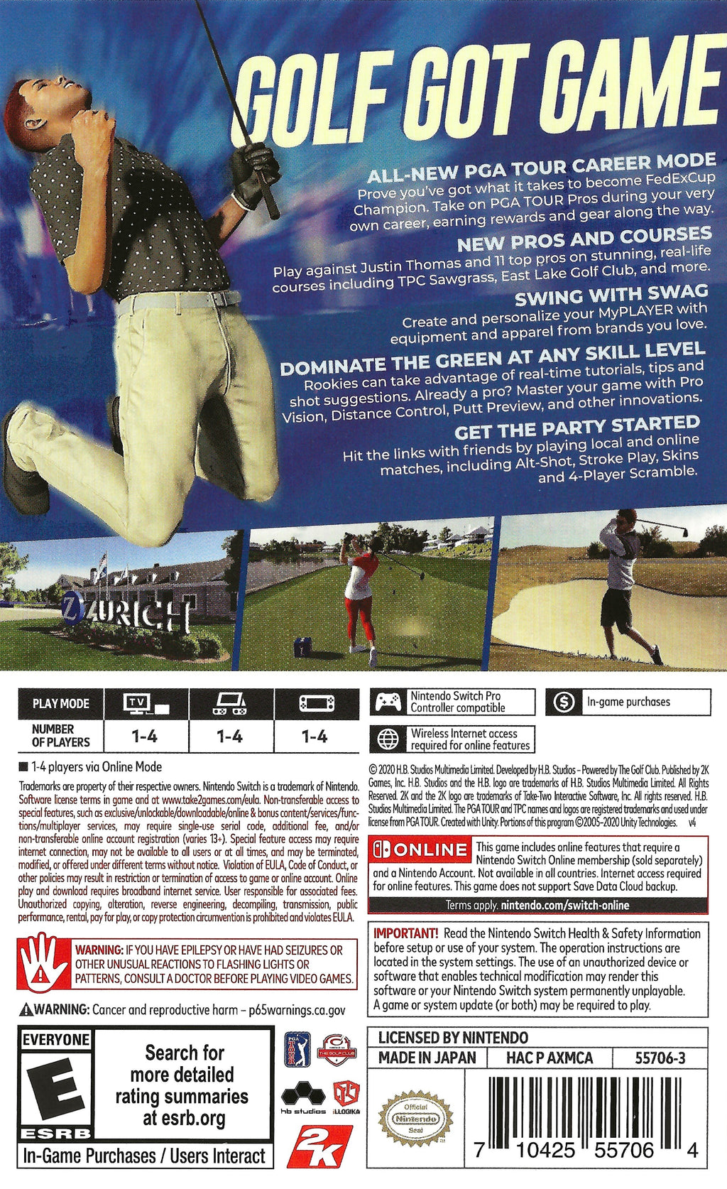 "PGA Tour 2K21" also supports the Nintendo Switch's portable capabilities, allowing you to tee off anytime and anywhere, whether you're at home or on the go. With easy-to-use controls and a variety of golf content, this game is perfect for fans of sports simulations looking to experience the prestige of PGA tournaments and improve their skills in a fun, interactive way.