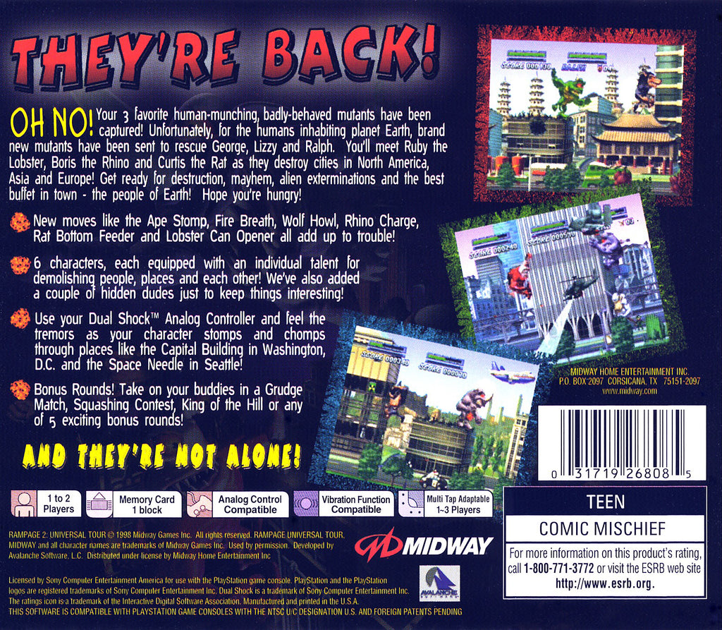 Immerse yourself in the multiplayer mode for even more mayhem, allowing you to team up with friends or compete head-to-head in a bid to become the ultimate destructive force. Whether you're a veteran gamer reliving childhood nostalgia or a newcomer seeking an adrenaline-filled adventure, "Rampage 2 Universal Tour" delivers non-stop entertainment and strategic gameplay. Perfect for any PlayStation enthusiast, this game promises endless hours of fun and a unique blend of humor and havoc. Get ready to smash, stomp, and obliterate your way through a massive world of chaos and adventure!