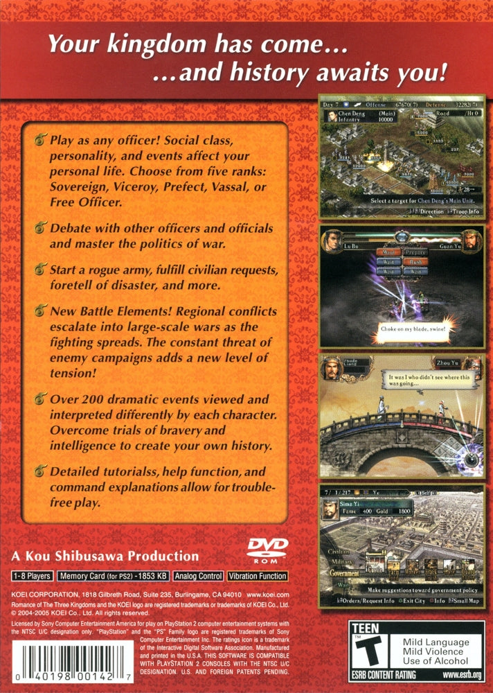 Experience the epic saga of ancient China with "Romance of the Three Kingdoms X" for the PS2, a captivating strategy game that immerses you in the political intrigue and tactical warfare of the Three Kingdoms period. As a leader of your own dynasty, make crucial decisions to expand your territory, forge alliances, and conquer rivals through a blend of diplomacy, strategy, and military prowess. This installment features intricate role-playing elements that allow you to develop your character and interact with over 800 historical figures, from legendary warriors to cunning strategists.