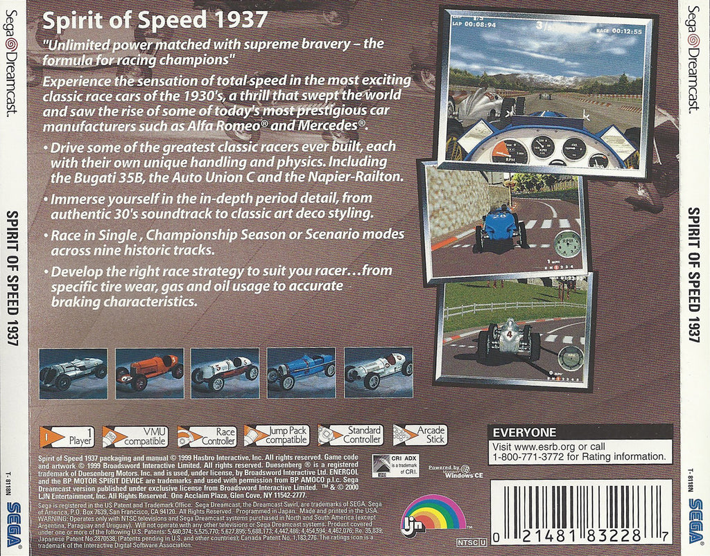 This DreamCast exclusive delivers an unparalleled blend of nostalgia and competitive racing, enabling players to engage in both single-player and multiplayer modes. "Spirit of Speed 1937" is compatible with a variety of DreamCast peripherals, enhancing gameplay and bringing the excitement of vintage racing to life. Dive into a comprehensive roster of legendary cars and circuits, each with its own strategic demands and historical significance, offering endless hours of exhilarating gameplay. Whether you're a seasoned racing fan or a casual gamer looking to explore the roots of motorsport legends, "Spirit of Speed 1937" promises to deliver a unique and captivating journey through the era of racing’s early pioneers.