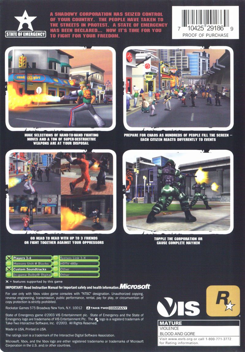 Unleash chaos and experience the thrill of rebellion in "State of Emergency" for Xbox, where players dive into a world fueled by anarchy and uprising. Set in a tumultuous urban landscape, this action-packed game from Rockstar Games challenges you to fight against an oppressive regime using a variety of weapons and strategies. Engage in large-scale battles, navigate through bustling city streets, and utilize the environment to your advantage in this fast-paced, adrenaline-pumping adventure. With its visually stunning graphics and dynamic gameplay, "State of Emergency" offers a truly immersive experience that keeps gamers on the edge of their seats.