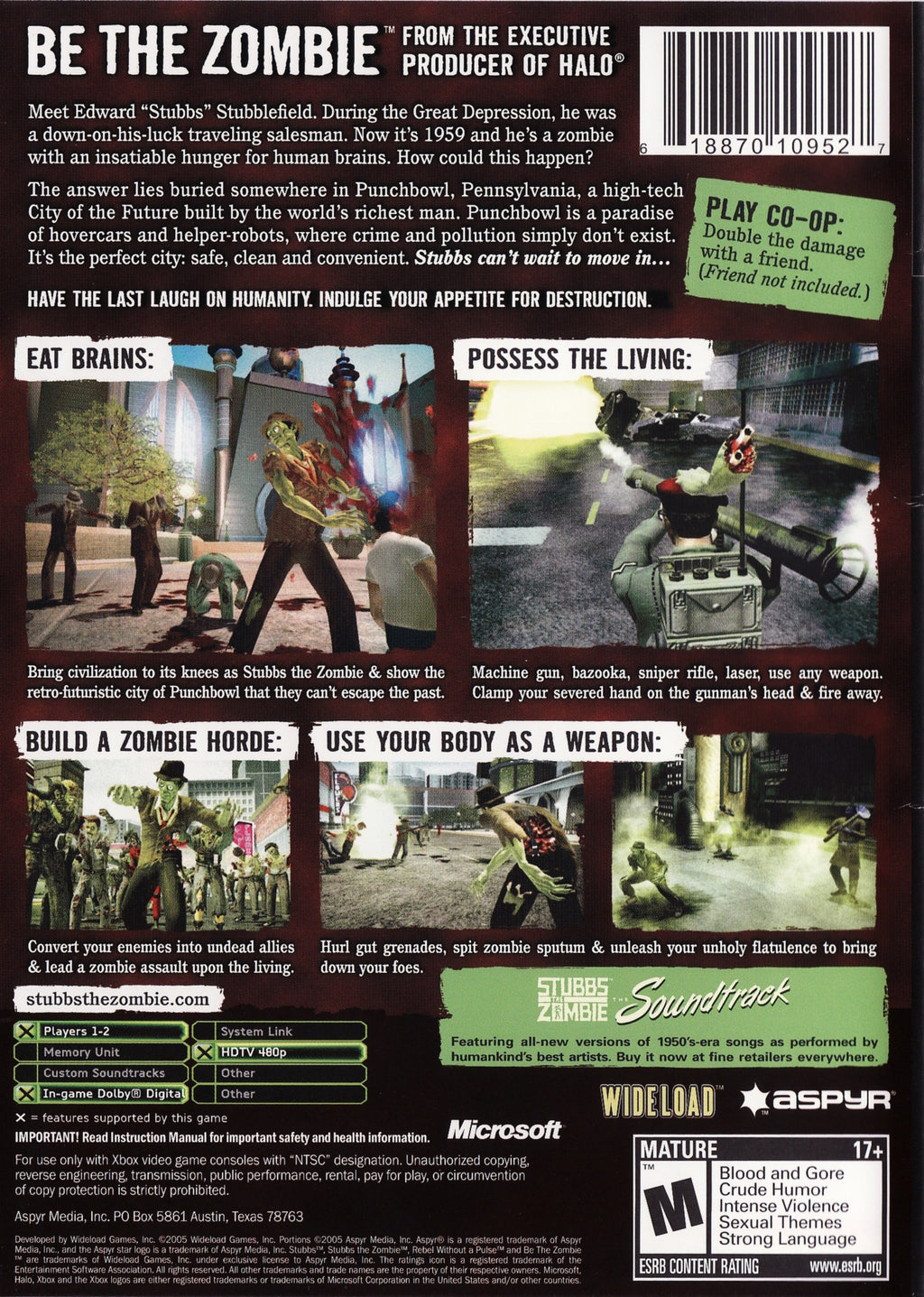 In addition to its captivating storyline and engaging missions, "Stubbs the Zombie in Rebel Without a Pulse" features an unforgettable soundtrack filled with classic tunes reimagined for a post-apocalyptic zombie theme. Perfect for both single-player enjoyment and local co-op play, it allows you to partner with friends and double the undead fun. Dive into a world of dark comedy and unpredictable adventures, filled with challenges and surprises at every corner. Quickly becoming a must-have for game collectors and zombie genre fans alike, this title guarantees endless hours of entertainment and laughs. Optimize your gaming library with "Stubbs the Zombie in Rebel Without a Pulse" and join the ranks of undead legend today.