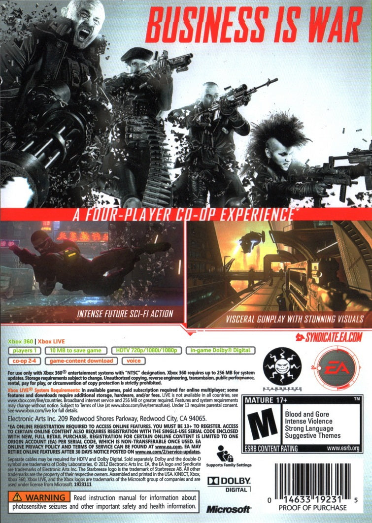 "Syndicate" on Xbox 360 not only offers a riveting single-player campaign but also an intensively cooperative multiplayer mode that lets you team up with friends to tackle challenging missions. With seamless controls and a unique blend of action and strategy, players can expect hours of electrifying gameplay. Perfect for fans of sci-fi and first-person shooters, "Syndicate" is a must-have for any Xbox 360 collection. Don't miss the opportunity to revolutionize your gaming experience with this fast-paced, high-tech adventure. Grab your copy of "Syndicate" today and delve into a future where you are the ultimate weapon.