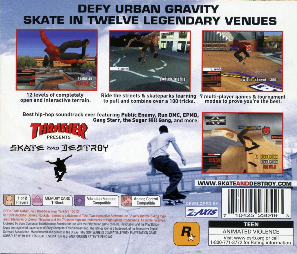 "Thrasher: Skate and Destroy" sets itself apart with its innovative control system that mirrors real-life skate mechanics, offering an unparalleled level of immersion. Customize your skater with a selection of decks, wheels, and attire, allowing for a personalized experience that reflects your unique style. With its gritty graphics and dynamic soundtrack featuring renowned hip-hop artists, this PlayStation classic captures the rebellious essence of skateboarding culture. Whether you're aiming to master every trick or simply enjoy the freedom of the skate park, "Thrasher: Skate and Destroy" promises hours of electrifying gameplay and non-stop fun.