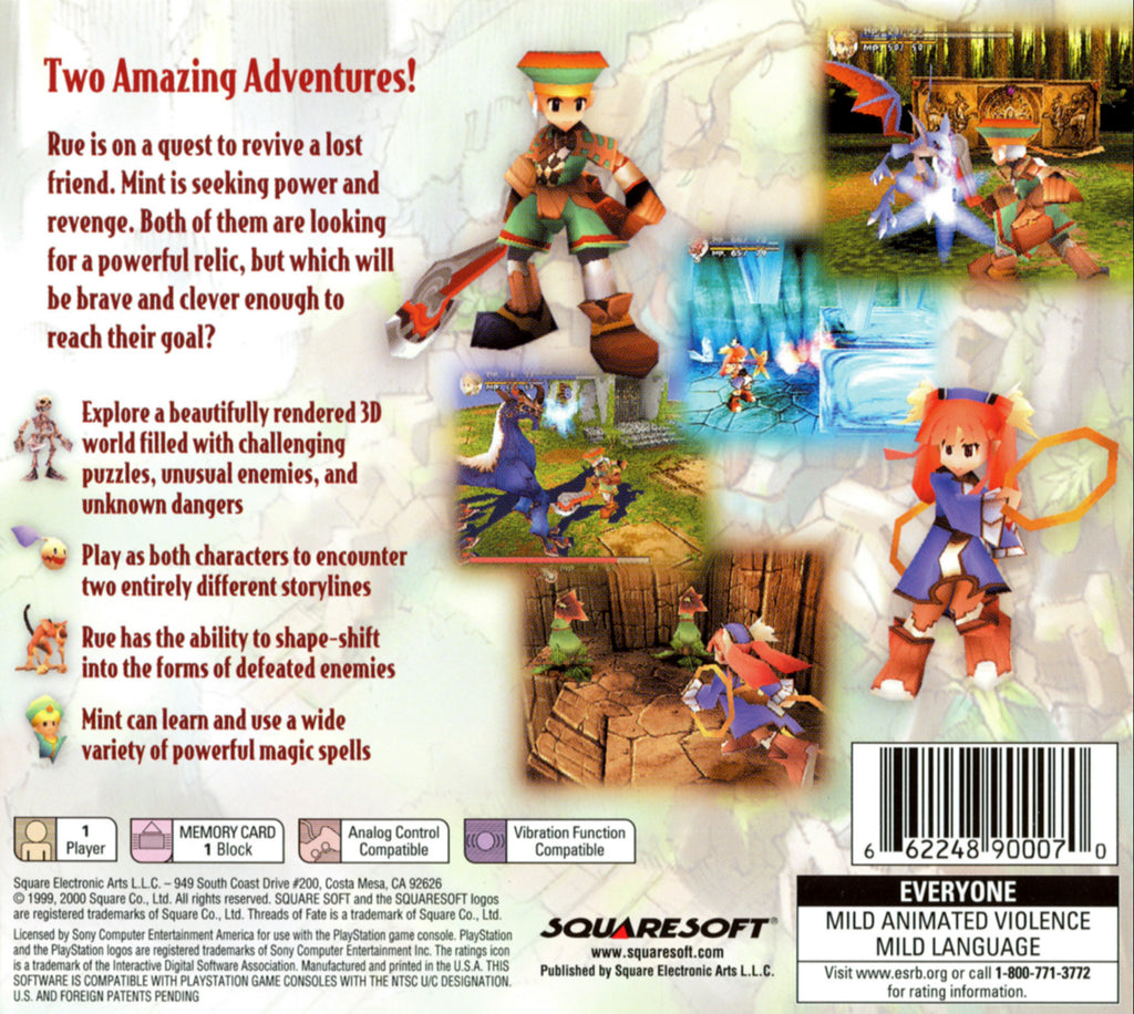 Discover the enchanting world of "Threads of Fate," a captivating action role-playing game for the PlayStation that will transport you into an epic tale of magic and destiny. This classic title offers players an immersive experience with its dual-character storyline, allowing you to choose between two protagonists, Mint and Rue, each with their unique abilities and distinct narratives. Whether you prefer the chaos-infused antics of Mint or the noble quest of Rue, "Threads of Fate" promises a dynamic adventure filled with challenging puzzles, formidable enemies, and spellbinding magic. Featuring beautifully crafted graphics and a rich, engaging soundtrack, "Threads of Fate" continues to be a favorite among PlayStation enthusiasts. The game's innovative mechanics and layered storytelling ensure hours of captivating gameplay that will keep you on the edge of your seat. Perfectly optimized for both nostalgia-driven players and new adventurers alike, this title seamlessly blends elements of wizardry, warfare, and wonder. Dive into the magical universe of "Threads of Fate" and begin your quest to shape your destiny today.