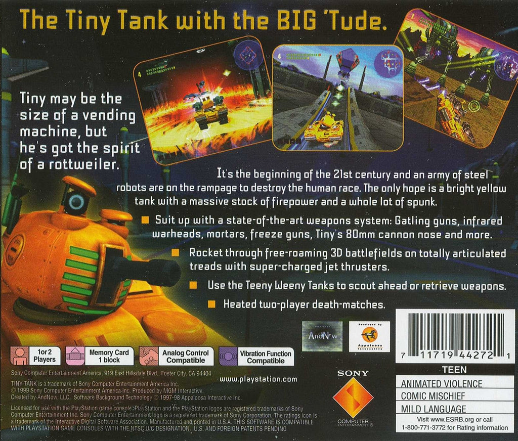 Discover the thrilling world of "Tiny Tank," a classic gem from the PlayStation category that delivers explosive action and nostalgia in one compact package. With its quirky personality and robust weaponry, Tiny Tank stands out as an unforgettable character on its mission to save humanity from an army of rebel droids. This action-packed game boasts innovative gameplay mechanics, immersive graphics for its time, and a witty sense of humor that captivates players of all ages. Whether you’re revisiting a childhood favorite or exploring it for the first time, Tiny Tank promises endless hours of entertainment and strategic combat challenges.