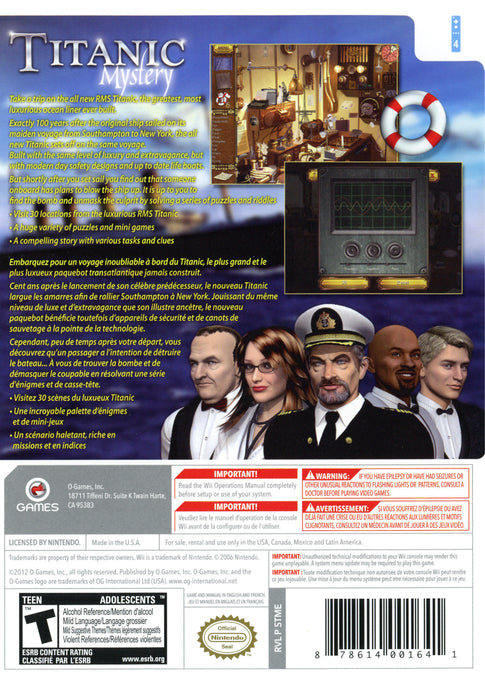 Designed with intuitive controls tailored for the Wii, "Titanic Mystery" ensures a seamless and engaging gameplay experience. Traverse the iconic ship's decks, interact with intriguing characters, and piece together the enigma before time runs out. Whether you're navigating through the lavish ballroom or exploring the mysterious corridors, every moment in "Titanic Mystery" is filled with suspense and excitement. Discover the secrets of the past and become part of history with this thrilling Wii game that promises hours of entertainment and mind-bending challenges.